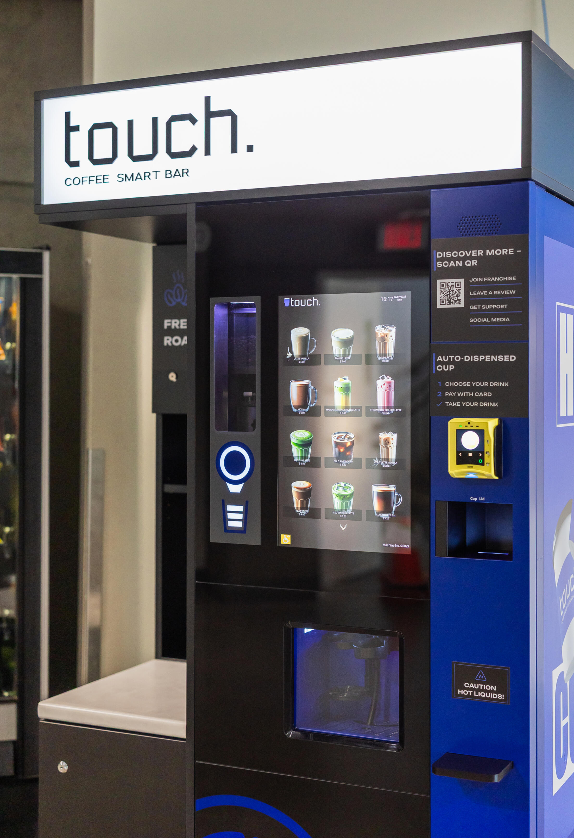 We deploy next-generation Touch Coffee Smart Bar systems across Los Angeles — serving espresso, specialty drinks, smoothies, and protein shakes in a sleek,